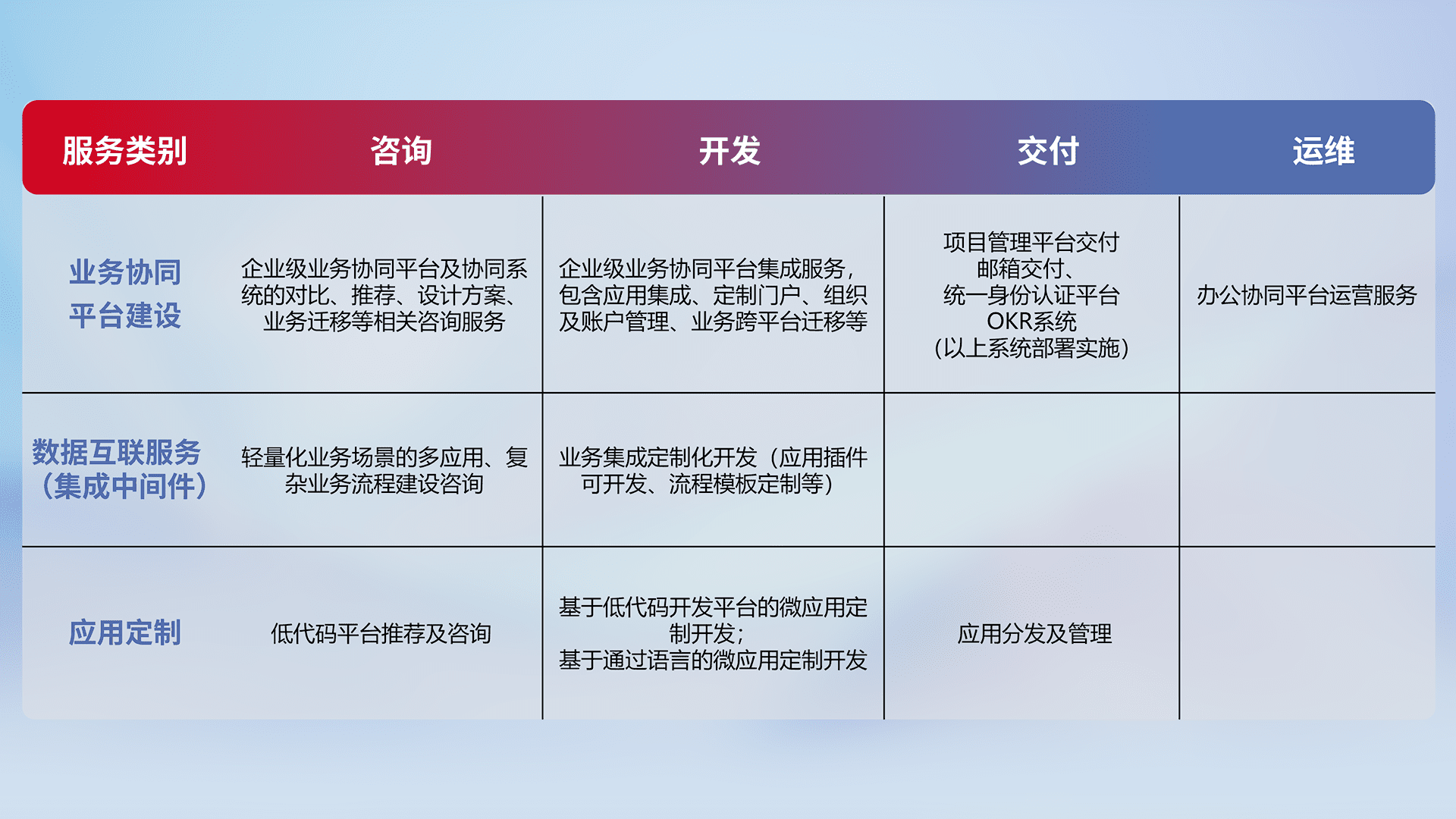 针对钉钉、、企微、、、、IDaas等平台级产品提供产品的规划、、、方案、、交付、、、定制化开发等服务,,实现如统一协同办公、、智能客户服务、、混合会议管理、、智能数据查询、、等业务场景,,,,实现数字化转型。。